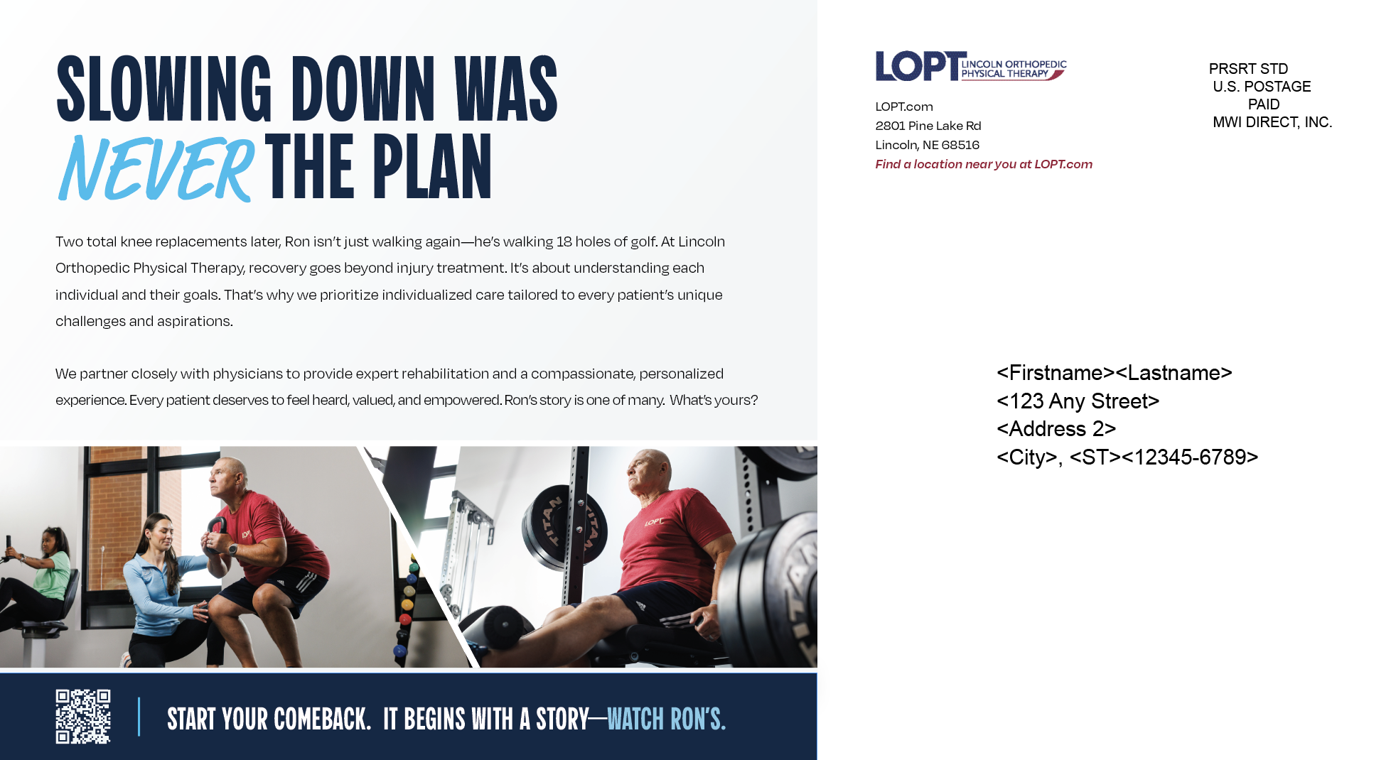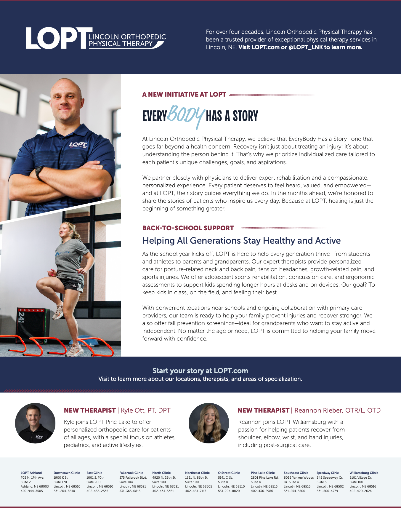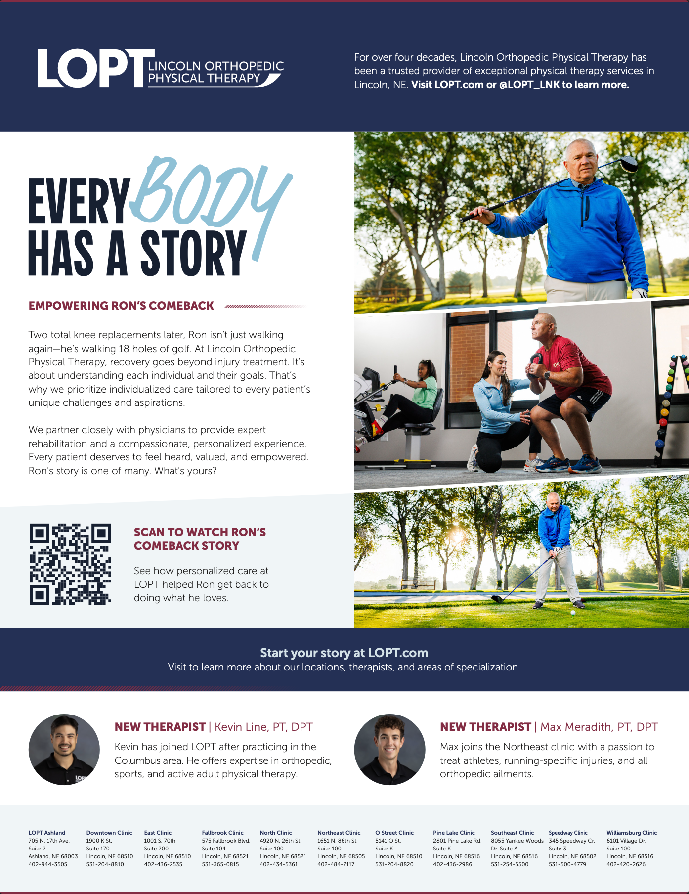 For more than four decades, Lincoln Orthopedic Physical Therapy has been a trusted provider of exceptional care, serving patients through ten facilities in Lincoln and one in Ashland, Nebraska. When LOPT came to UNANIMOUS, they had already developed the EveryBody Has A Story concept and were seeking a brand awareness campaign to bring it to life. I concepted, presented, and built a compelling visual identity around the message and recommended a strategic marketing plan and supporting tactics to amplify its impact. Centered on LOPT’s belief that recovery goes far beyond treating an injury, the campaign highlights the importance of understanding each patient’s unique challenges, goals, and aspirations—ensuring every individual feels heard, valued, and empowered. Since the deployment of the campaign, LOPT has hired 4 new employees, announced the opening of a new location, and have received over 500 new patient calls.